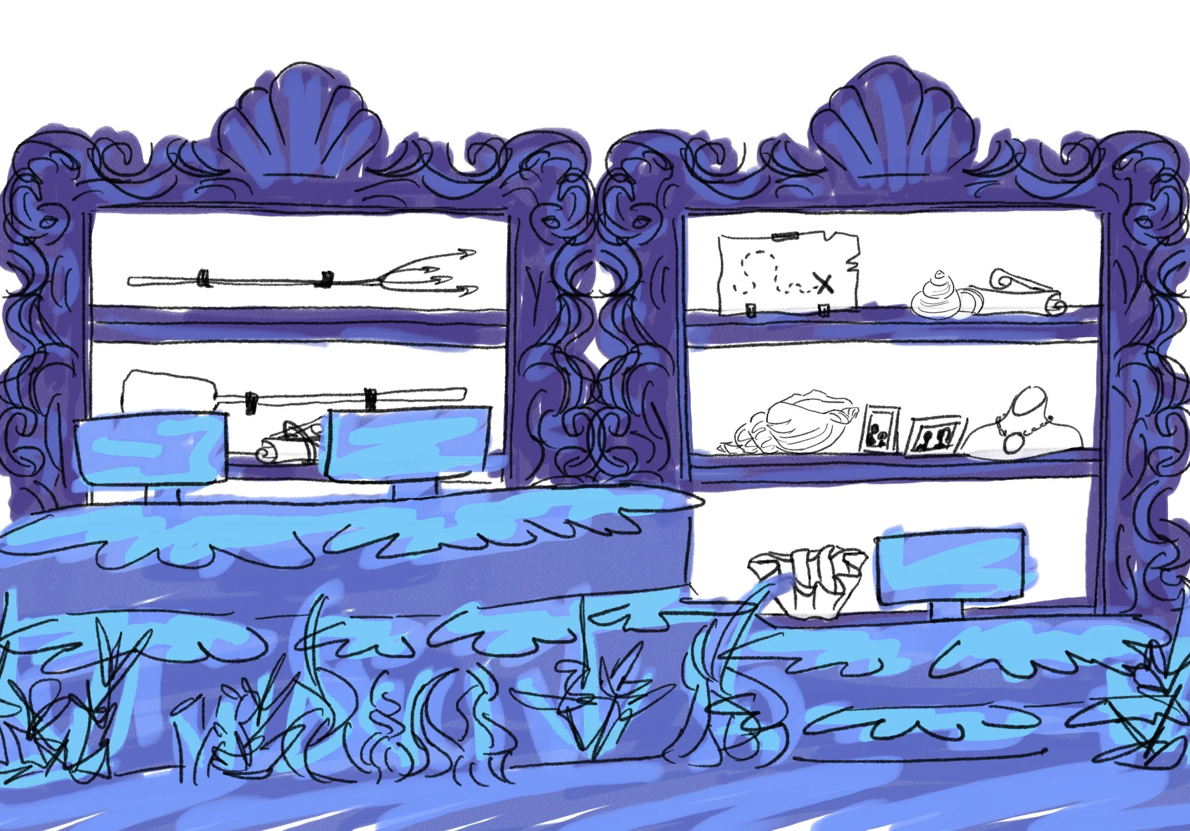 View our my team’s full process book here, which includes work by my collaborators McKenna Kreiling, Sofia Munoz, and Sasha Raskin. In addition to project managing this concept, I created the key concept art, wrote the backstories and story treatment, designed the scavenger hunt, drew the characters, 3D modeled five of the structures in SketchUp, and edited the renders in Photoshop.